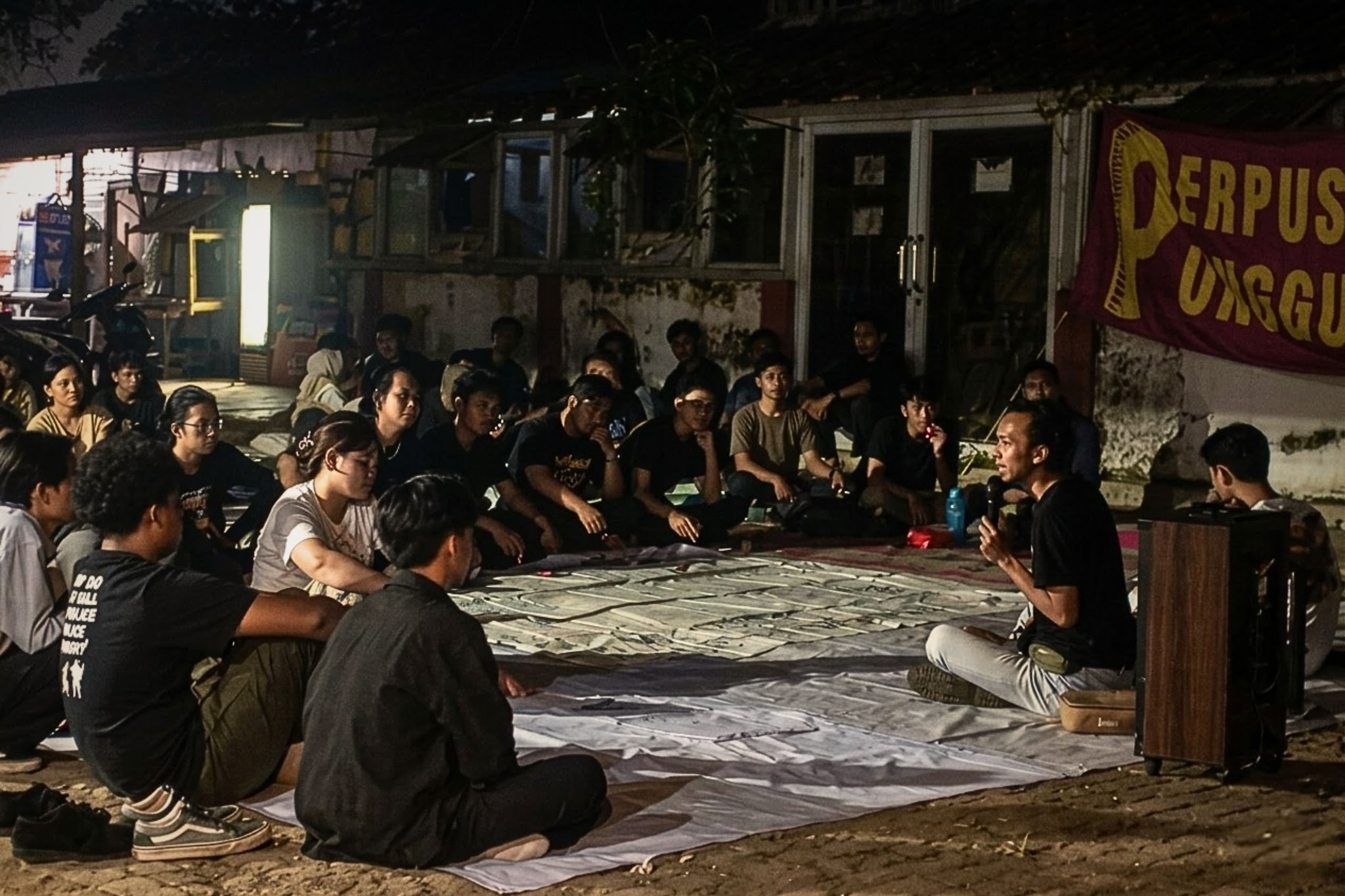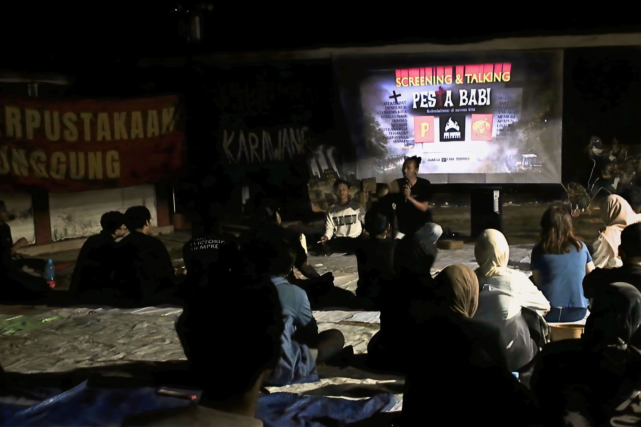 Perpustakaan Punggung bersama Aksi Kamisan Karawang menggelar kegiatan nonton bareng (nobar) dan diskusi film dokumenter berjudul Pesta Babi di kantin belakang Universitas Singaperbangsa Karawang (Unsika), Jumat (17/4/2026). Kegiatan ini bertujuan membuka kesadaran mahasiswa terhadap isu ketidakadilan yang masih berlangsung di Papua, meliputi perampasan tanah adat, hilangnya sumber pangan, dan eksploitasi lingkungan akibat Proyek Strategis Nasional (PSN).