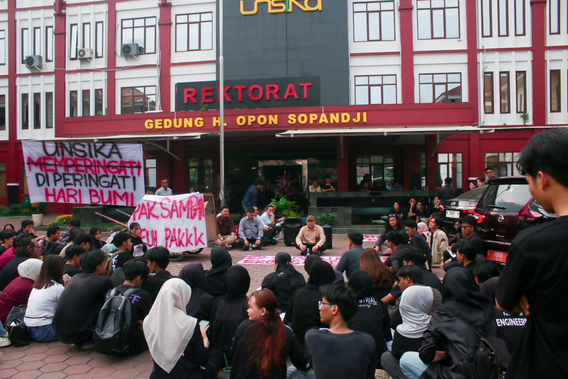 Dalam rangka memperingati Hari Bumi Internasional, Rabu (22/4/2026), mahasiswa Universitas Singaperbangsa Karawang (Unsika) yang terdiri dari berbagai Organisasi Mahasiswa (Ormawa) melakukan aksi di depan Gedung Rektorat. Mahasiswa menuntut pihak rektorat untuk segera menyelesaikan berbagai permasalahan lingkungan yang ada di Unsika, baik kampus satu maupun kampus dua.